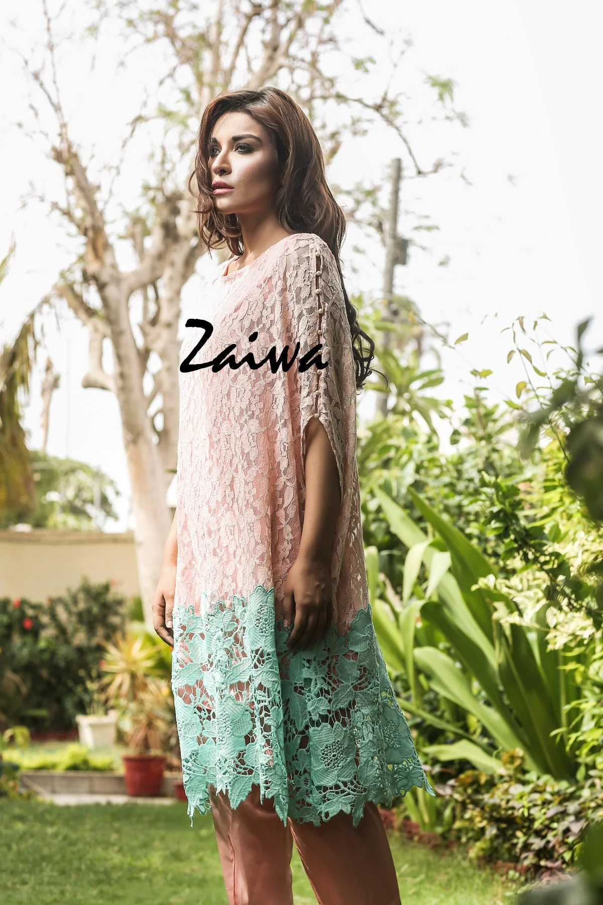 Very stylish ready to wear Pearls detailed crochet applique cape with inner and tulip pant by zaiwa