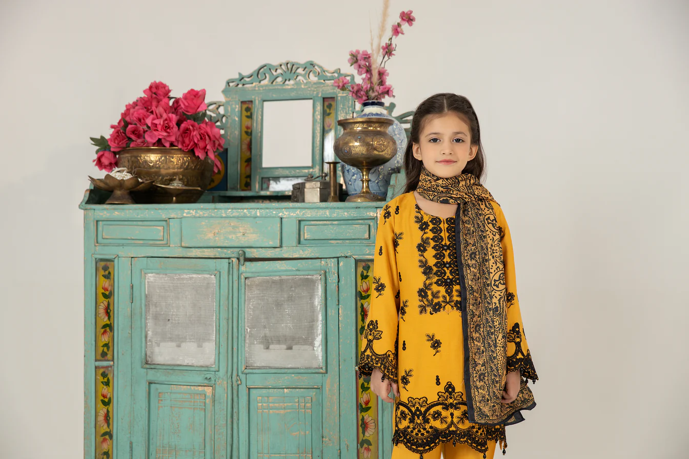 3pc Ready to Wear Winter Dhanak dress with digitally printed wool shawl and dhanak trousers with buttons.