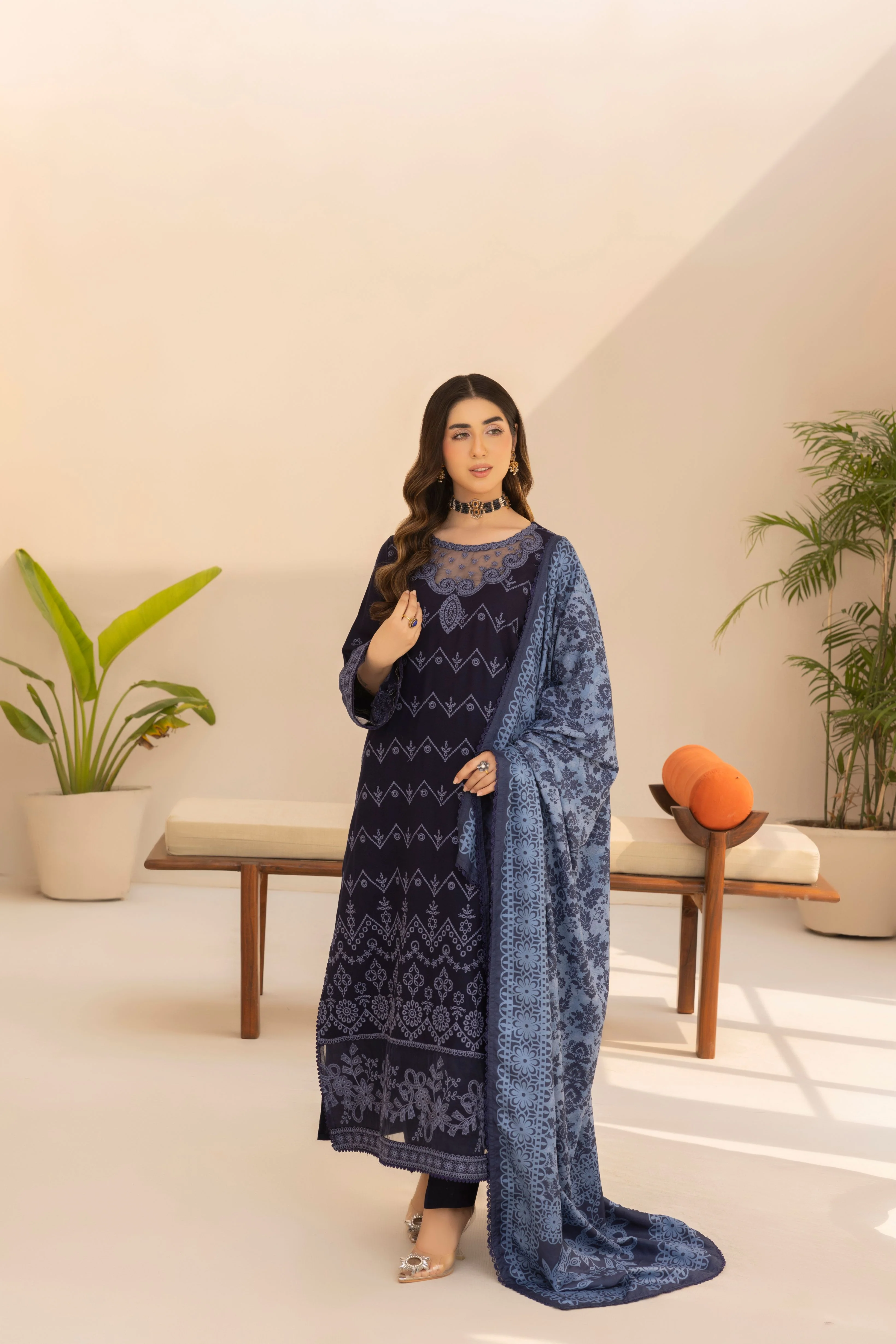 Channel timeless sophistication with this deep navy-blue ensemble from Threads of Elegance by Mohagni. The 48-inch dhanak shirt is adorned with intricate embroidery in a mesmerizing geometric and floral pattern, beautifully enhanced with delicate lace and sheer detailing at the neckline. The outfit is paired with coordinating dhanak trousers for a polished winter look. Completing the ensemble is a printed winter shawl in soft blue hues, featuring intricate motifs and an ornate border for a regal finish. An effortlessly graceful outfit perfect for winter soirées and festive gatherings.